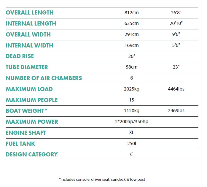 Cependant, le Sport 800 n'est pas qu'un bateau pour jouer. La coque Deadrise à 26 degrés, basée sur la célèbre coque Patrol, vous permettra de naviguer en toute sécurité dans des eaux agitées. La large console offre un abri et une grande ergonomie tout en offrant la possibilité d'installer des toilettes portables. Les sièges de style baquet pour le conducteur et le passager offrent un excellent confort, qu'ils soient assis ou debout. Le grand réservoir de carburant vous offre toute l'autonomie nécessaire pour explorer en toute confiance plus loin et pour les aventures nocturnes, l'éclairage de courtoisie à LED complète encore davantage le style luxueux du SP800.