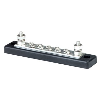 Avec 10 vis #8 pour connexion des fils venant des appareils électrique et 2 bornes 1/4'' avec écrous, pour les fils venant de la batterie. Vis et plaque étamées. Courant max. 150A.