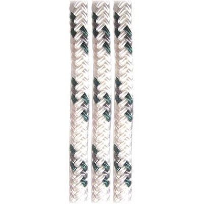 Cordage de polyester (dacron) double tressage. Très polyvalent. Faible étirement et bonne résistance à l'abrasion. Usage: drisses, écoutes, contrôles de chariots. Cordage 1/4'' blanc avec traceur vert. Vendu au pied. Rupture: 1550 lb. Étirement: 10%.