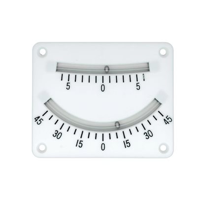 Échelles de -45° à 45° et de -10° à 10°. Boîtier en plastique moulé blanc.