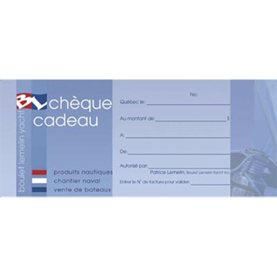 Valid for all products at Blyacht. Can be used for a telephonic order and in store. For website order, please call us with the Gift Certificate number once you've placed the order. You want to offer a Gift Certificate with a customized amount, you only have to combine the certificates of 50$ and 100$ and Boulet Lemelin Yacht will ship you a Gift Certificate with the correct amount.
