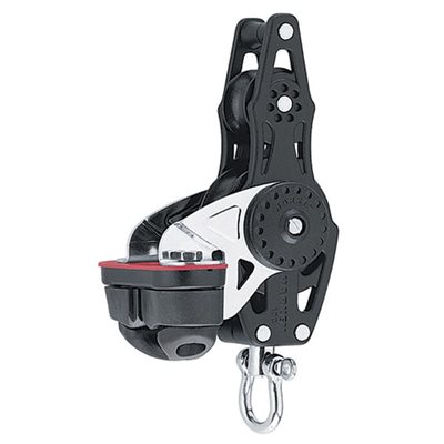 Carbo 57mm fiddle block with becket and cam. Ball bearings, sheave and sideplates UV stabilized with black additive for a maximum protection. The high-load 57mm Carbo has a broad working range. For 7/16'' rope. Working load: 792 lb. Sheave: Long-glass reinforced engineered nylon. Ball bearings: Engineered plastic in fitted ball races. Sheave size: 2 1/4'' (57mm). Line diameter: 7/16'' max. Cheek material finish: Long-glass reinforced engineered nylon. Shackle/strap: Stainless swivel shackle.