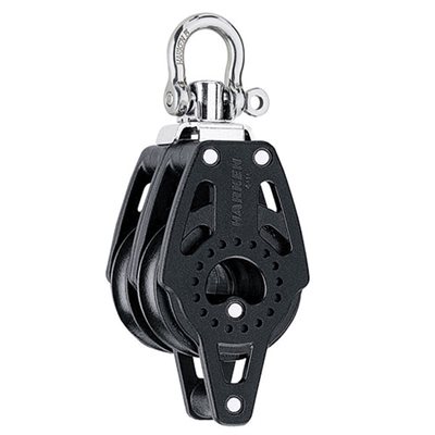 Carbo 57mm Double block with swivel and becket . Ball bearings, sheave and sideplates UV stabilized with black additive for a maximum protection. The high-load 57mm Carbo has a broad working range. For 7/16'' rope. Working load: 1584 lb. Sheave: Long-glass reinforced engineered nylon. Ball bearings: Engineered plastic in fitted ball races. Sheave size: 2 1/4'' (57mm). Line diameter: 7/16'' max. Cheek material finish: Long-glass reinforced engineered nylon. Shackle/strap: Stainless swivel shackle.