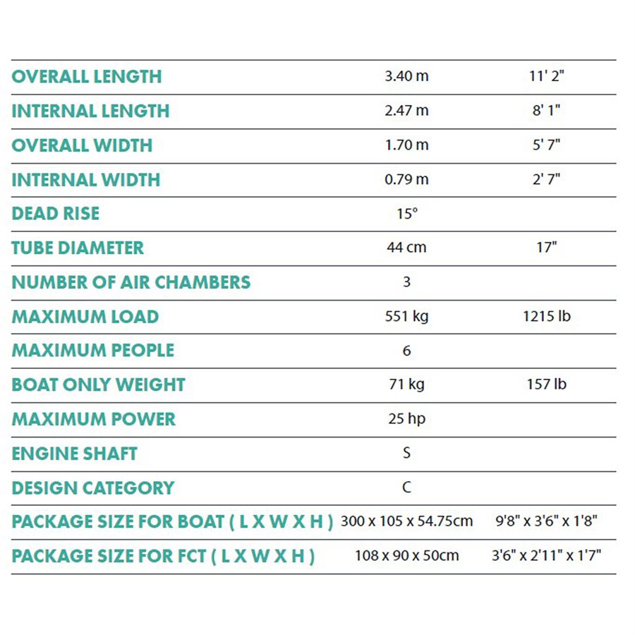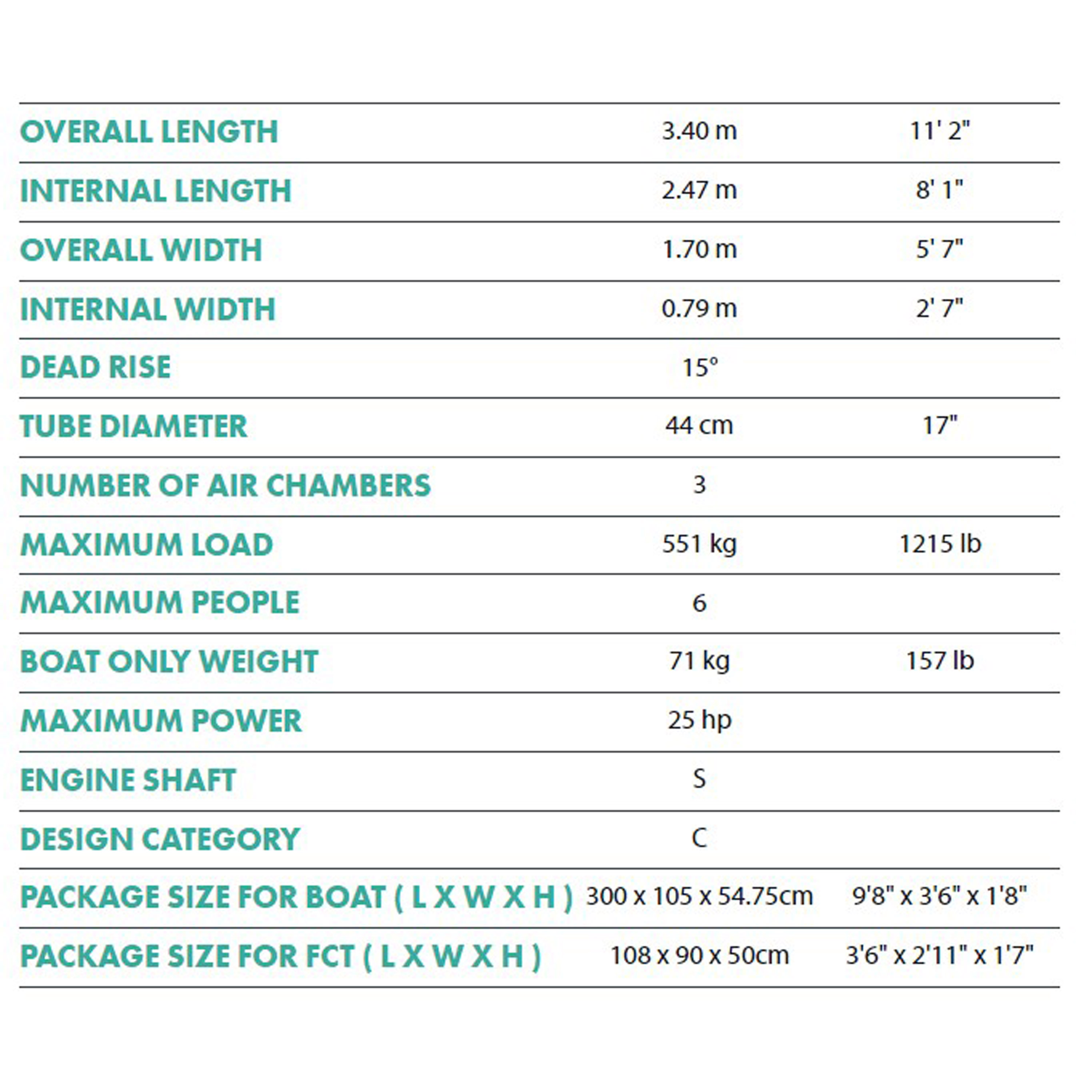 The hulls of the Classics are built of 2.5mm thick powder coated marine grade aluminium. The tubes are made of 1100 dtex coated fabric.