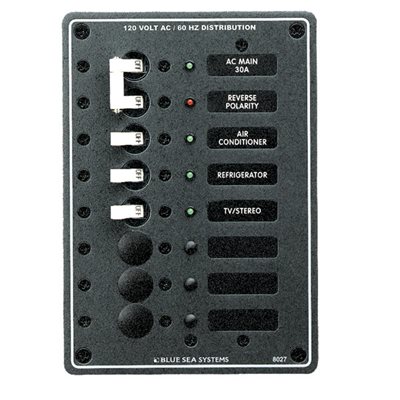 Includes one 30A two-pole breaker with ''On'' indicator lights and reverse polarity indicator light, 3 single 15A magnetic breakers, as well as 30 self-adhesive labels for breakers. Three other breakers and their indicator lights can be added.