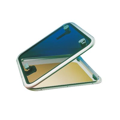 Very tough, very low-profile model with ratchet hinges allowing for the panel to stay open at various angles or to be open at 180° or in ventilating position. The handle includes a locking mechanism and it can be opened from outside when unlocked. Smoke. Overall dim.: 22 5/8'' x 22 5/8''.