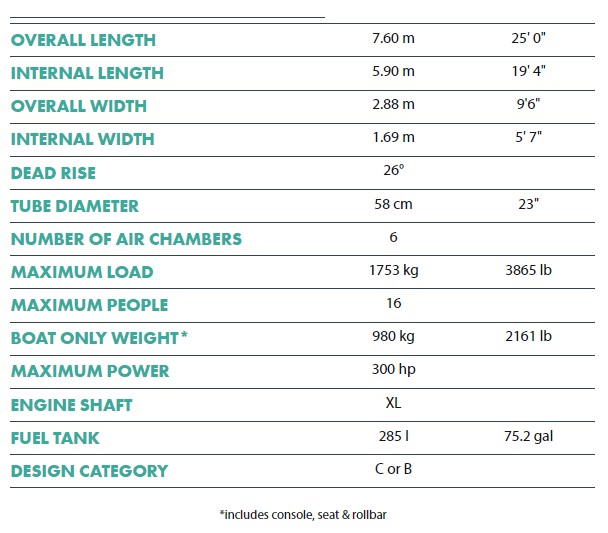 The hull is built from 5083 aluminium plates with 6 and 10mm stringers. With their super deep V, wide chines and large diameter tube, they offer high manoeuvrability, high safety and a soft dry ride even in the roughest conditions.