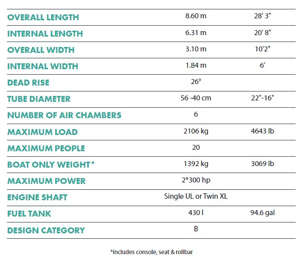 The hull is built from 5083 aluminium plates with 6 and 10mm stringers. With their super deep V, wide chines and large diameter tube, they offer high manoeuvrability, high safety and a soft dry ride even in the roughest conditions.