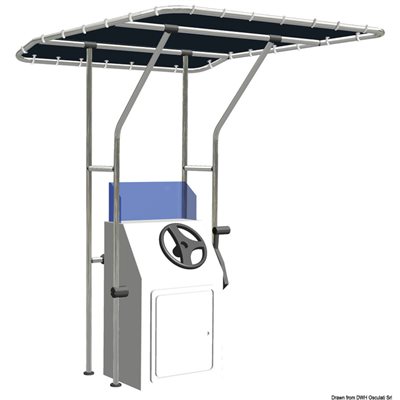 32-mm Ø anodized tube. Universal for any type of console since the connections are adjustable. Waterproof and UV-resistant blue ATLAS polyester fabric that can be removed for maintenance. All stainless parts. Max allowable speed when T-top is installed: 25 knots.