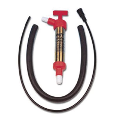 This multi-purpose compact pump with metallic body is supplied with a 24'' long 1/2'' hose and a 1/4'' x 40'' hose for oil change. Dimensions: 10 1/4'' x 1 3/4'' in diameter.