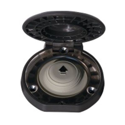 Waterproof, with hinged cover. Diameter is 3''. Maximum current is 5A. To be used with a solenoid for high current. Black. (Up).