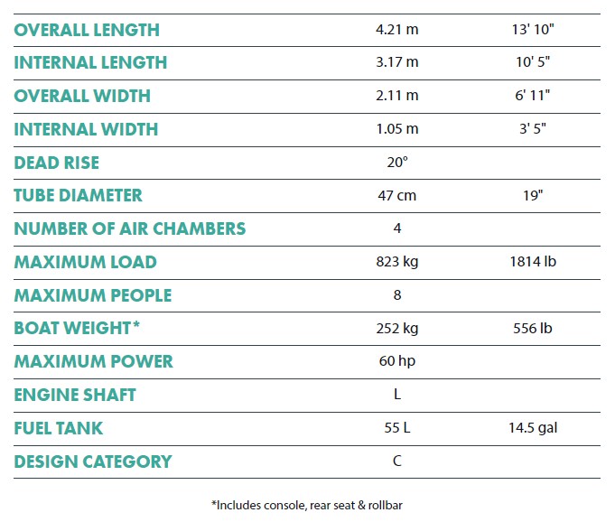 The hull is built from 5083 aluminium plates with 6 and 10mm stringers. With their super deep V, wide chines and large diameter tube, they offer high manoeuvrability, high safety and a soft dry ride even in the roughest conditions.