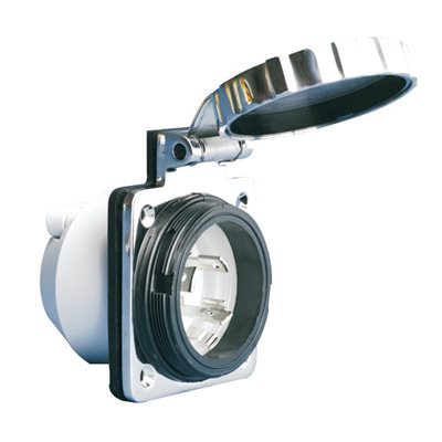 This electrical inlet is made of marine quality solid stainless steel. Watertightness is ensured by non-corrosive nylon threadings. The cover is designed to stay open while your are using your power cord. Use a #10 triple wire between the inlet and the distribution panel.