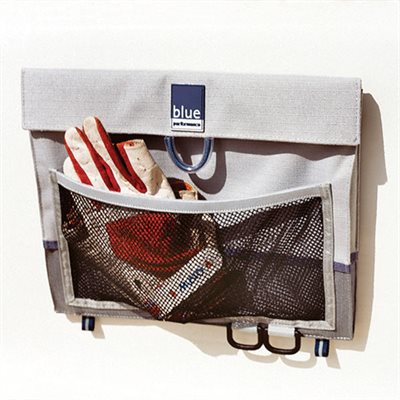 Cockpit organizer. Made of durable UV-protected nylon. A stowable rain cover pulls over the main pouch to protect contents while an outside mesh pocket grants easy access to snacks or sunscreen. The included stainless-steel fastener and hook system allows for quick mounting and removal of the bag for storage. Includes everything needed for easy installation.