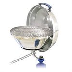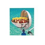 This grill was designed for economy without sacrificing functionality. Made of 100% 18-9 mirror polished stainless steel, it will give you the safety, durability and performance required of a marine grill. It uses our time-tested, highly efficient radiant plate heat distribution system in conjunction with convection heating technology to achieve hot, even temperatures while using a minimum of fuel. It comes to temperature very quickly and is great for searing steaks or just grilling up some burgers and dogs. The patented swiveling turbo venturi tube allows you to adjust the control valve inboard, outboard, left or right wherever it is most convenient to you. This design also allows for quick safe fuel canister changes even while grilling. The turbo venturi tube in combination with the newly designed burner virtually eliminates blow-outs. The grill quickly disassembles without tools for easy clean-up.