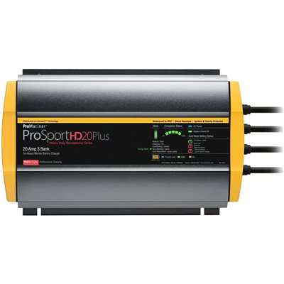 ProMariner ProSportHD 12 volt charging - 20 amp Plus - 3 bank battery on-board charger. 5 Stage charging includes - analyzing, charging, conditioning, maintaining & storage profiles. Supports Flooded, Gel and AGM group 24-31 battery design. Waterproof and shockproof construction with microprocessor software controlled technology. Energy Saver mode automatically maintains battery charge when the batteries determine they require it. Storage mode automatically reconditions batteries monthly for maximum battery life. Ignition protected, with over-voltage and over-current protection. Pre-wired 6 foot fused DC charging cables and 6 foot AC cord with 3 prong plug. 3 Year Warranty.