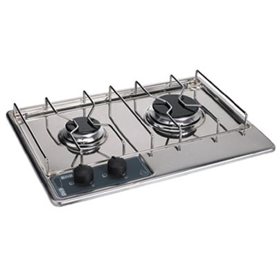 2-burner stainless steel propane cooktop stove. Electronic ignition CE certified. 2-year warranty.