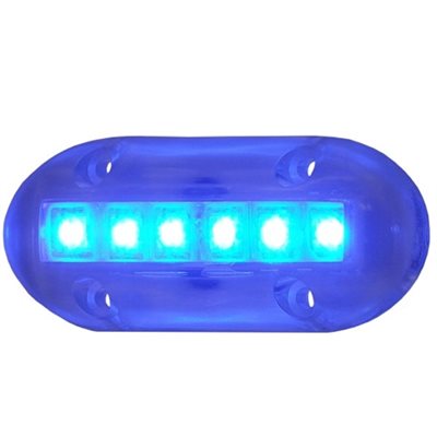 Totally Waterproof High Intensity LED Underwater Light. These High-Intensity LED Underwater Light are totally waterproof and designed to be used above or below the water line.  A broad flood light effect is created by the engineered optics of the convex light face. Surface mount or small hole for wiring. 6 Super Bright  LED’s. Lower amperage draw (130mA) and longer life than conventional bulbs. 100,000 hour life. No high heat like most other underwater lights. Also Suggested for Transoms, Trim-Tabs and T-Tops. Stainless Steel hardware Included . Dimensions: Surface size: 3.5" x 1.5" . Height: 1.2" with mounting spacer or 0.7" without spacer. Proven to attract bait fish to during night trips, and add ambiance to any vessel. Blue.