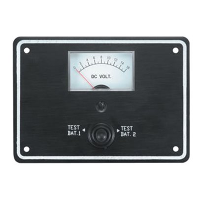 Battery test meter for 2 banks. Switch allows either bank to be measured. Black aluminum plate measures 5-1/4W x 3-3/4H, and comes with mounting gasket. Meter scale reads 0-16Volts.