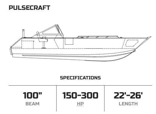 The Pulsecraft boasts a fully welded motor bracket and 25” transom, with horsepower options ranging from 150 to 300 HP.