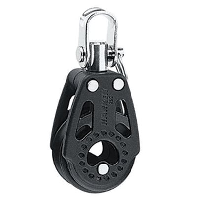 Poulie simple à émerillon Carbo 75mm. Pour cordage de 9/16''. Charge de travail: 1213 lb. Réa en nylon renforcé à longue fibre. Dimension du réa: 2 15/16'' (75mm). Roulements à bille: plastique renforcé dans une cage de roulement. Cordage max: 9/16''. Finition des joues: nylon renforcé à longue fibre. Type d'émérillion: acier inox.