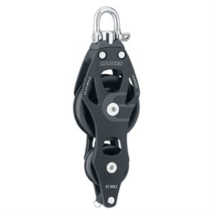 Poulie triple avec émérillon Carbo 57mm. Pour cordage de 7/16''. Charge de travail: 2380 lb. Réa en nylon renforcé à longue fibre. Dimension du réa: 2 1/4'' (57mm). Roulements à bille: Plastique renforcé dans une cage de roulement. Cordage max: 7/16''. Finition des joues: Nylon renforcé à longue fibre. Type d'émérillon: Acier inox.