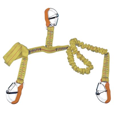 Sangle élastique double rétractable pour harnais de sécurité avec 3 mousquetons en inox. S’allonge de 1 à 2 mètres le long de sa partie extensible. Livrée avec mousqueton anti-accrochage et anti-ouverture accidentelle. Couleur doré avec mousquetons bleus.