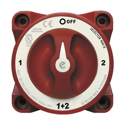 Permet de sélectionner 1 ou 2 batteries. Taux de 350 A en continu, 900A en démarrage. Peut être encastré ou monté en surface. À l'épreuve des étincelles. Rouge à bouton noir. 4'' x 4''.